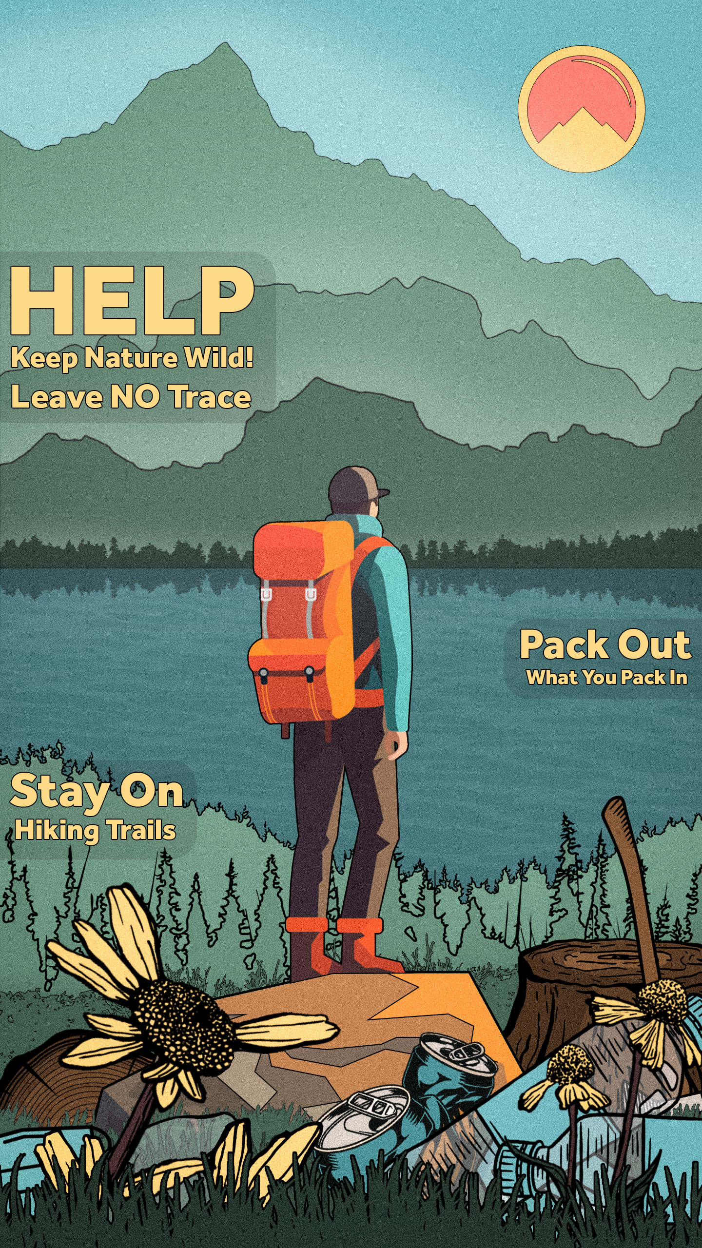 This infographic shows a subject looking over a beautiful lake-side mountainscape. The foreground is riddled with trash, including water bottles, aluminum cans, masks, and plastic bags. The foreground also features flowers that are crippled by hikers who have ventured off the trail. In the midground are tree stumps accompanied by an axe handle, signifying deforestation and human impact.