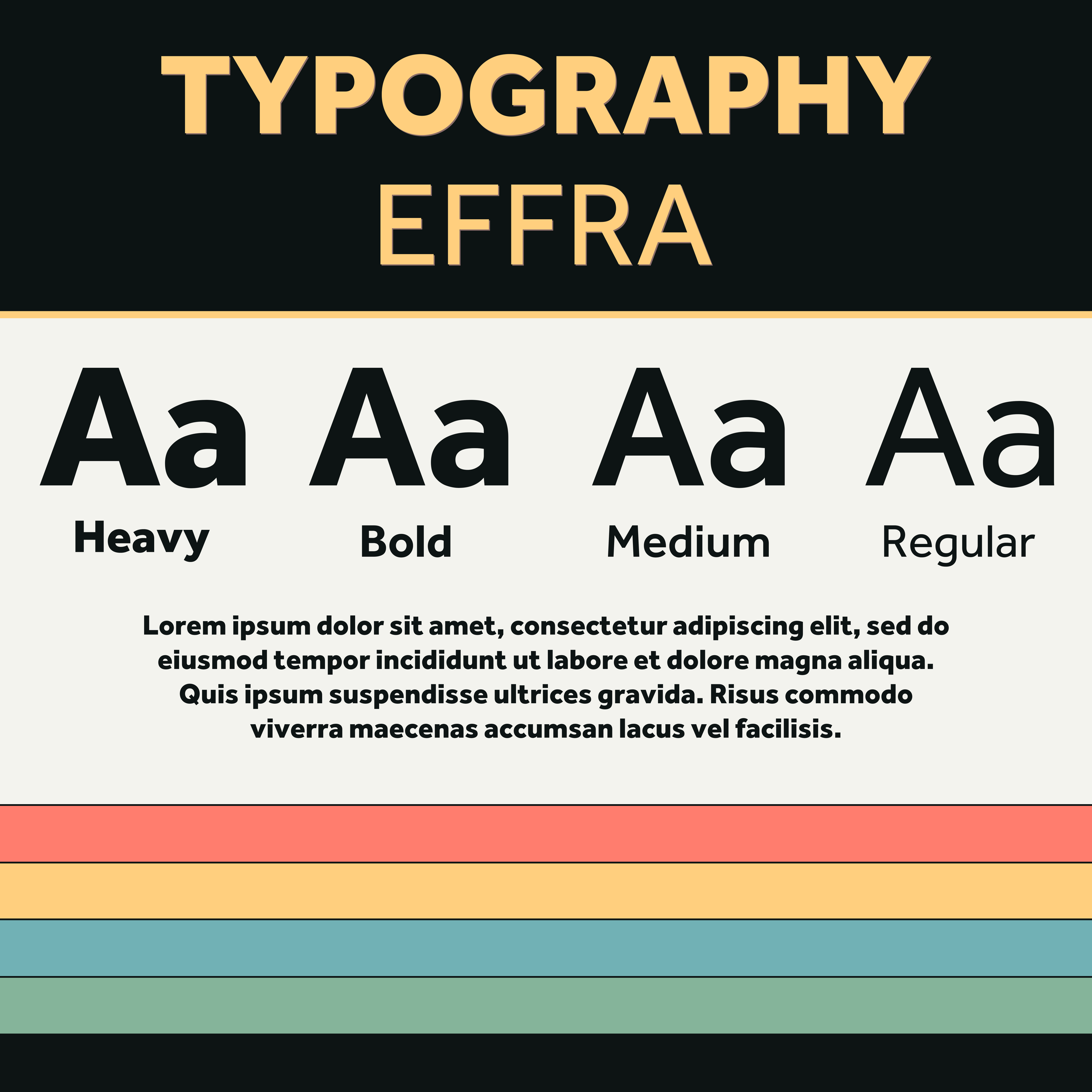Taylor and I wanted to choose a font that reflected the company's commitment to high-quality design and visual aesthetics. We ended up falling in love with Adobe’s font, Effra. Effra is a modern sans-serif typeface that is both elegant and versatile, with clean lines and geometric shapes that give it a timeless and contemporary look.